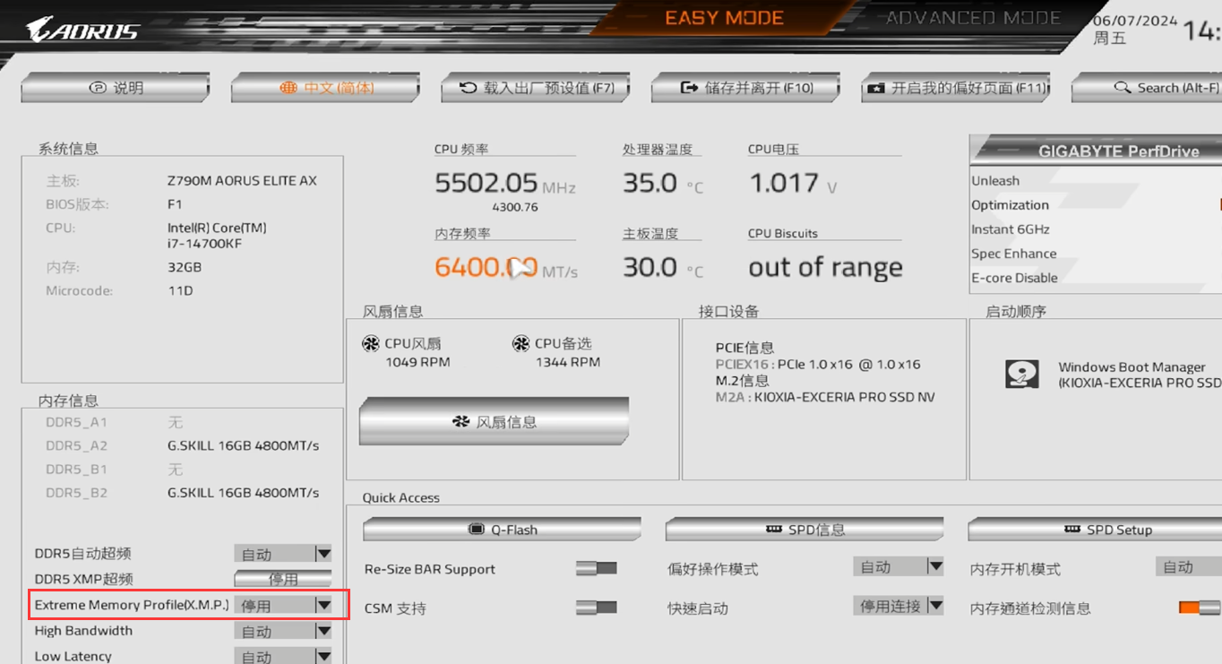 技嘉主板XMP,在左下角找到Extreme Memory Profile(X.M.P)设置”XMP1“的选项。(AMD平台如果有EXPO则优先选EXPO)