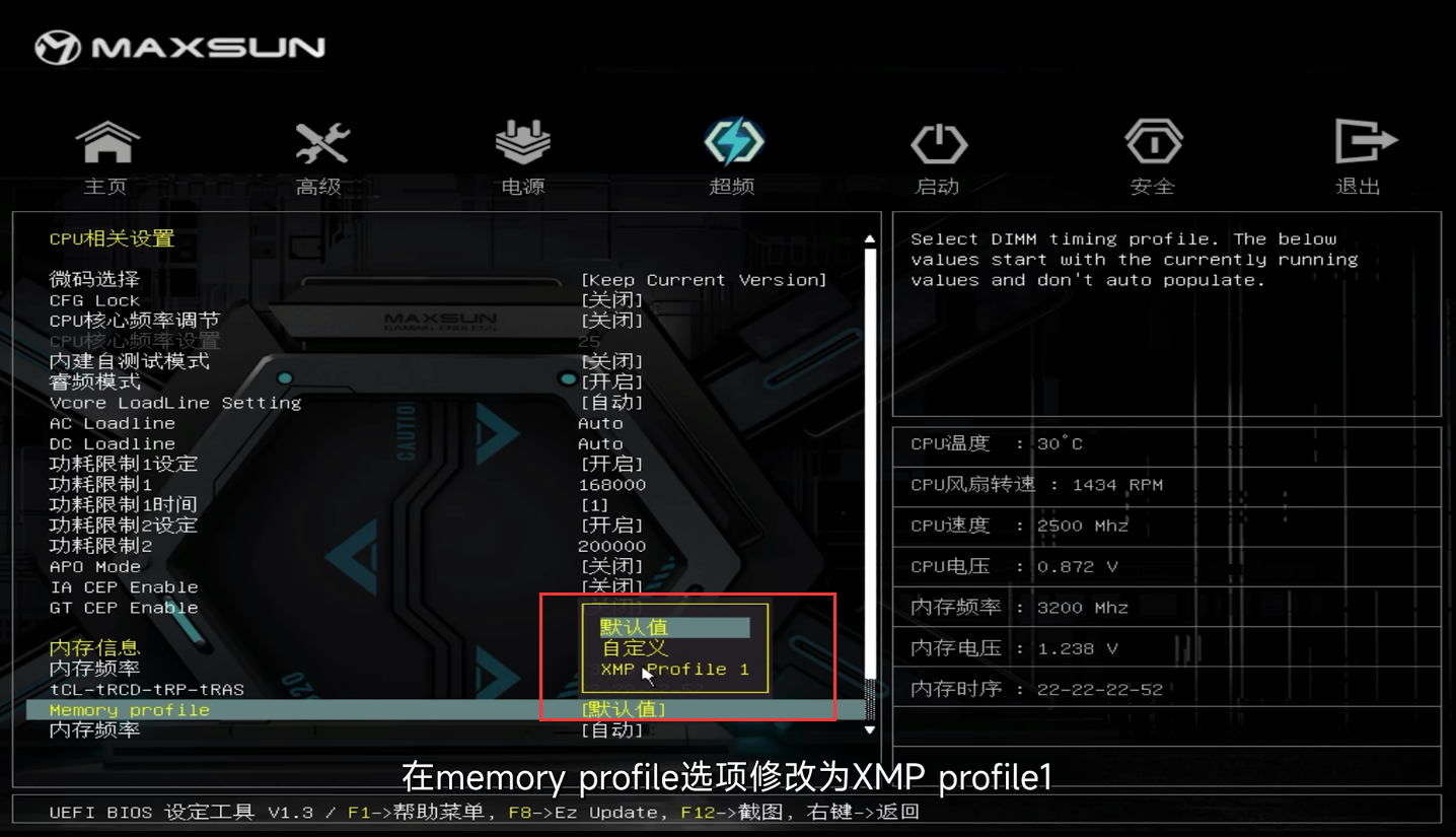 铭瑄主板XMP,先选择顶部“超频”选项,然后找到哦Memory profile,点开后设置“XMP Profile 1“