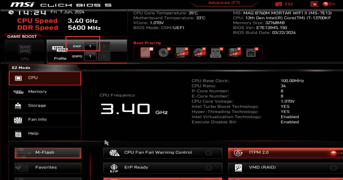 微星主板XMP,在左上角找到XMP的选项,点击一下“1”,此选项会变成红色(AMD平台如果有EXPO则优先选EXPO)