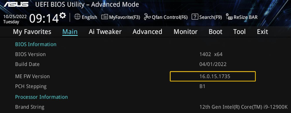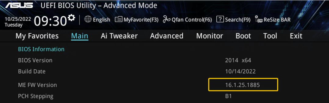 进入BIOS高级模式下的Main菜单下,可以看到当前的ME固件版本为16.0.15.1735