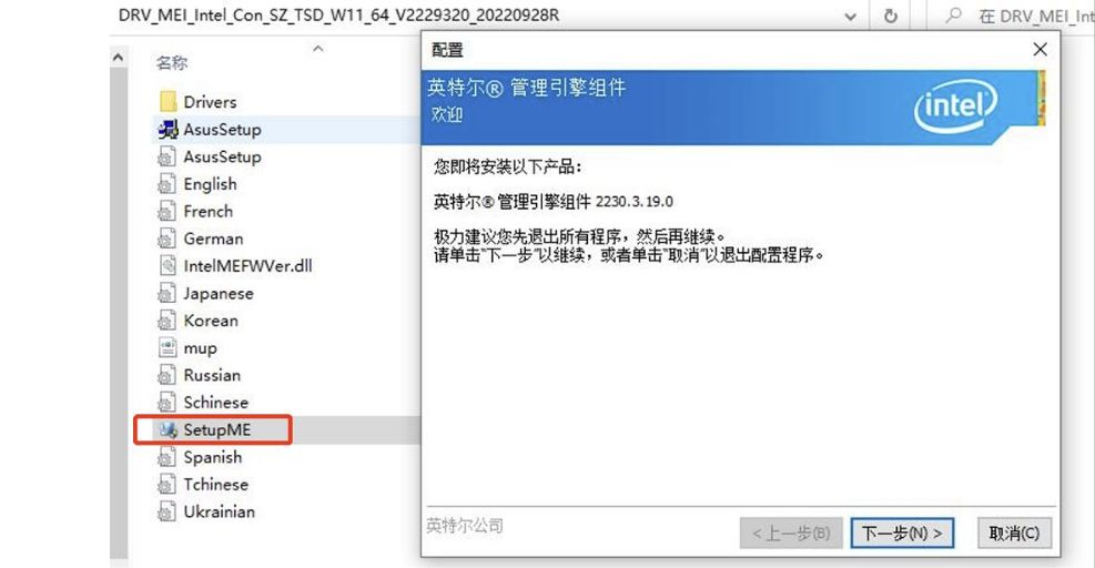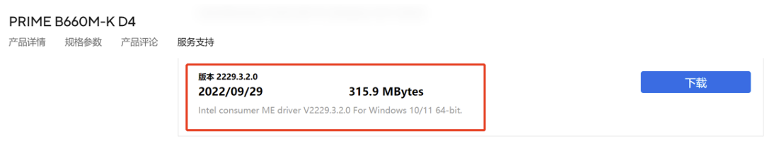 在执行ME 固件更新之前,请先务必安装官网驱动芯片组驱动中的ME驱动部分,否则直 接运行ME固件更新会报错。 https://dlsvr04.asus.com.cn/pub/ASUS/mb/03CHIPSET/DRV_MEI_Intel_Con_SZ_TSD_W11_64_V2229320_20220928R.zip
