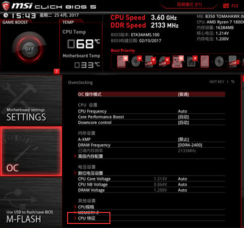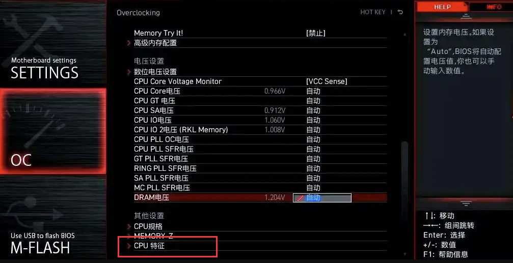 2、点选左边”OC”的选项,然后在中间设置下面找到“CPU Features“的选项