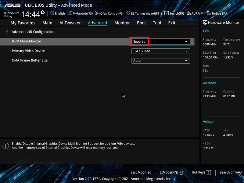 4. 点选[IGFX Multi-Monitor]选项并设置为[Enabled]开启,想要关闭则设置为[Disabled]