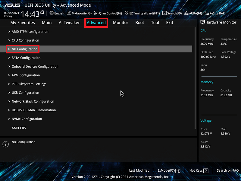 3. 点选 [Advanced]页面并点选[NB Configuration]选项