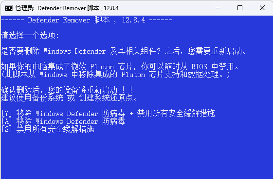 4、右键以管理员运行软件,按键盘 Y 即可完全移除Windows Defender