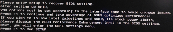 计算机开机后,会出现BIOS设定已被重置的提示。按照提示按F1进入BIOS设定界面,按F5加载 [Load Optimized Defaults] 值或重新设定BIOS,再按F10储存离开。