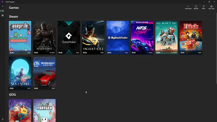 DLSS Swapper支持市面上主流的游戏平台安装的游戏,会自动扫描并添加至游戏库。三方平台的游戏同样也支持,只需要选择游戏的目录文件即可添加进游戏库。