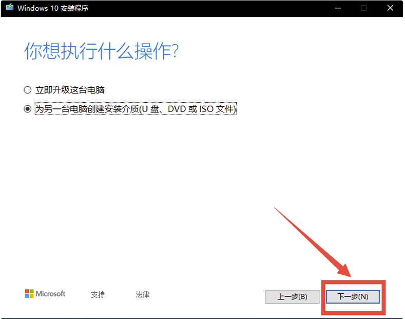 3. 在您想要执⾏什么操作?⻚⾯上,选择为另⼀台电脑创建安装介质,然后选择下⼀步。