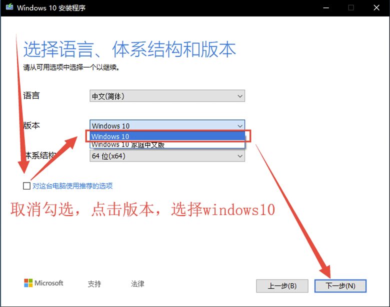 4.选择 Windows 10 的语⾔、版本和体系结构(64 位或 32 位)。(此处去掉左下⻆的勾选,选择windows10 64 位)