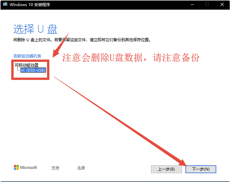 5.选择您要使⽤哪种介质: 选择U盘,然后选择下⼀步。