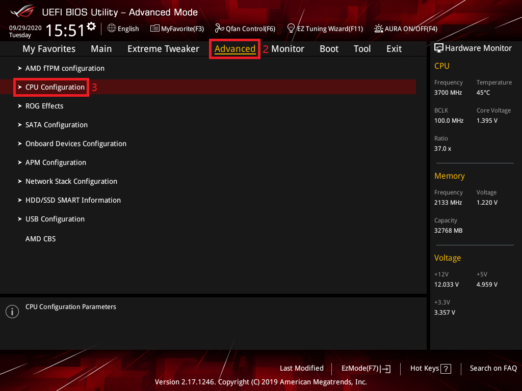2. 点选 [Advanced]页面并点选[CPU Configuration]选项
