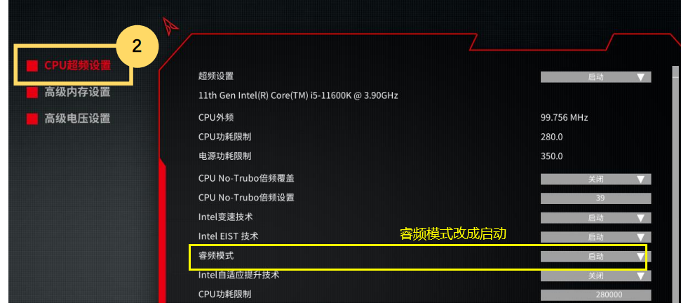 然后在左边找到CPU超频设置,再将睿频模式改成启动