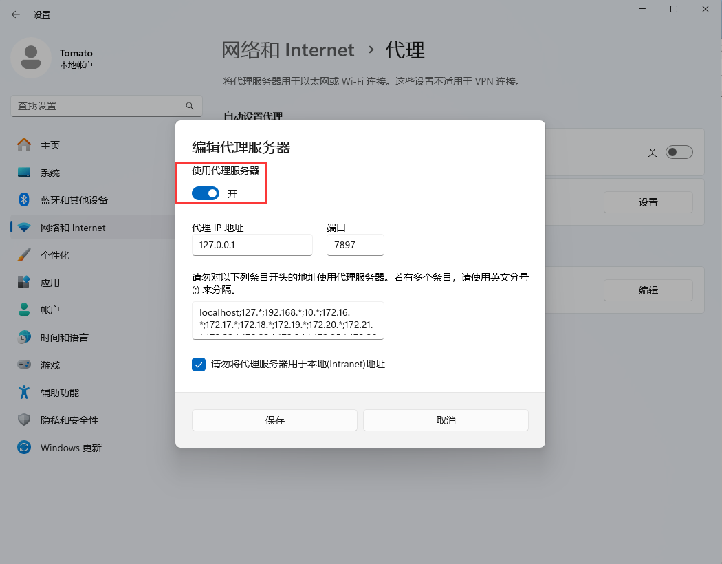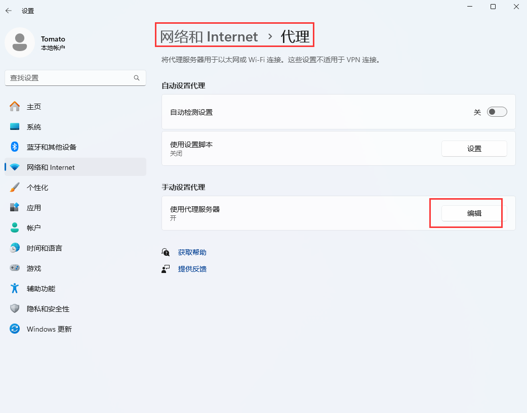 若您的系统启用了局域网代理服务器,请尝试关闭它。在Windows搜索框中输入“代理服务器设置”,进入后在手动设置代理服里面点编辑,并关闭“代理服务器设置”
