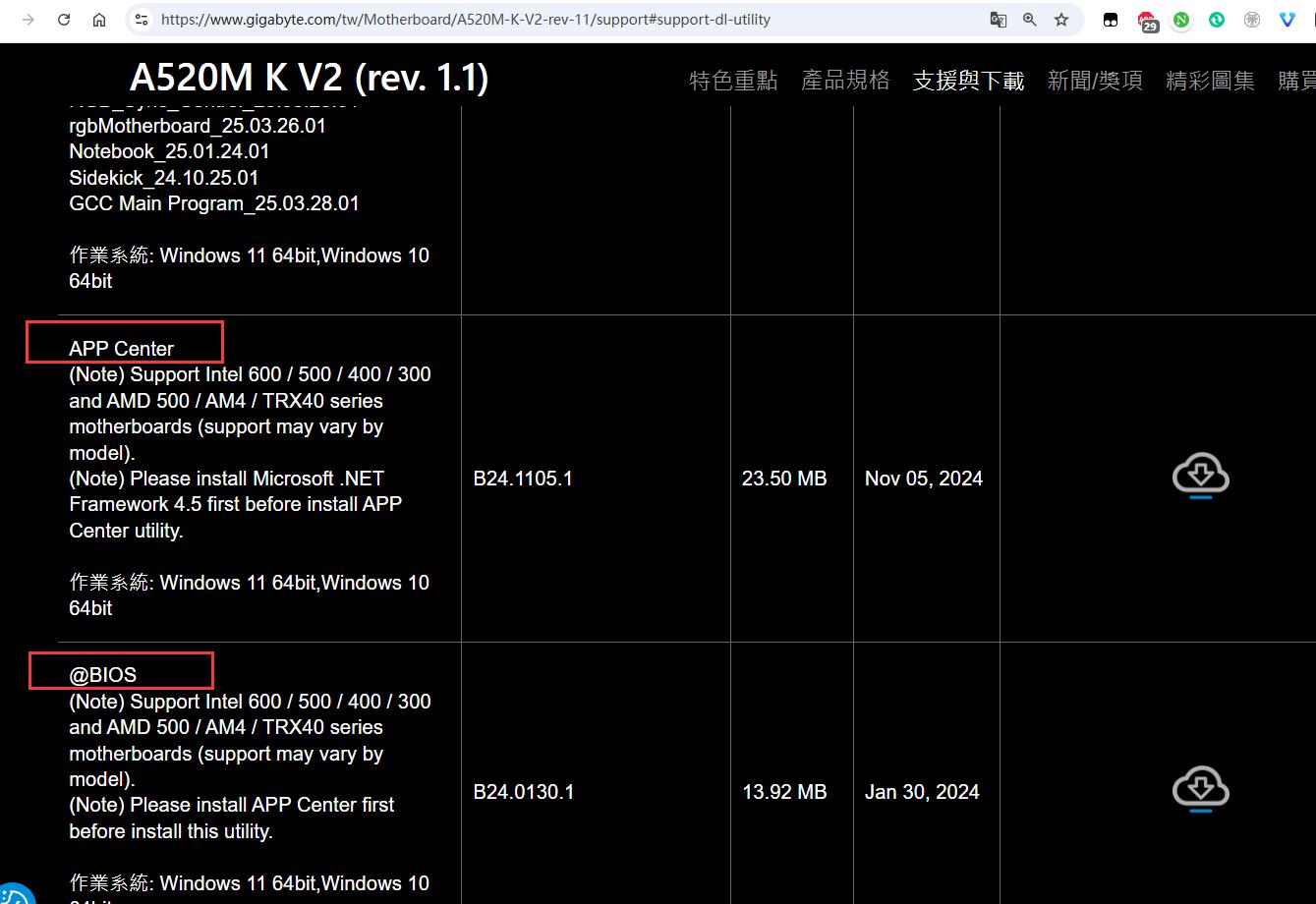 根据主板型号到技嘉官网的支持与下载页面下载APP Center和@BIOS两个文件