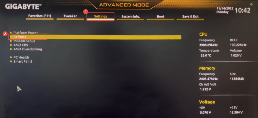 1、按电脑开机键后连续按【Del键】进入BIOS,切换到【Settings(设置)】,选择【IO Ports】;
