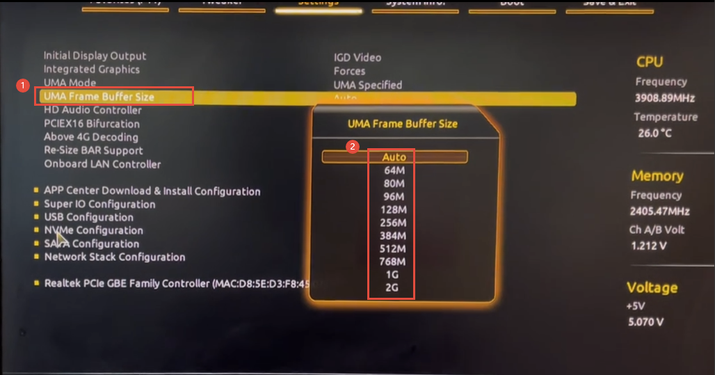 4、这时会发现多出了【UMA Frame Buffer Size】选项,这里我们就可以更改核显显存大小了;