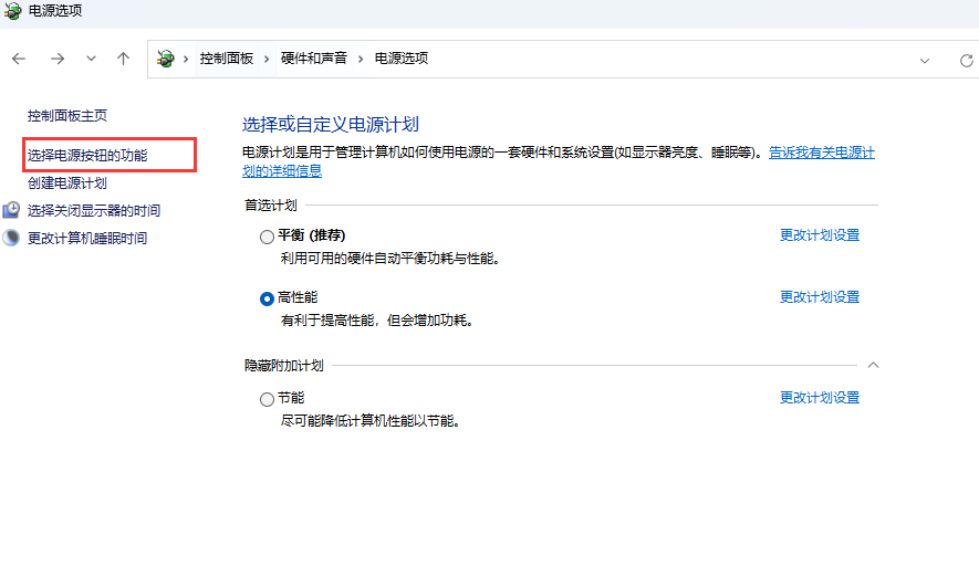 在电源选项窗口中,点击左侧的“选择电源按钮的功能”