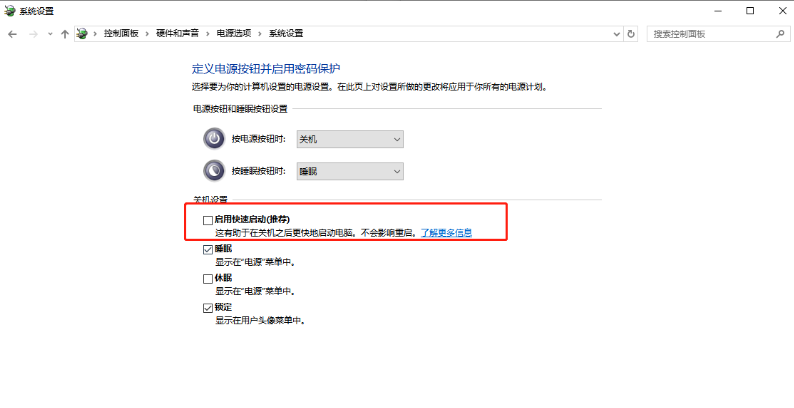 在“关机设置”部分,取消勾选“启用快速启动(推荐)”选项。
