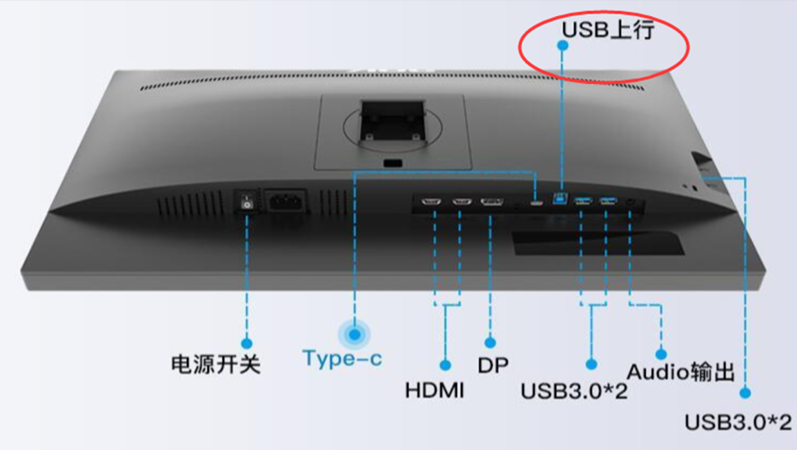 显示器使用usb上行线连接显示器USB上行接口,另一头连接到电脑USB接口,显示器上的USB接口才能使用,相当于一个USB Hub,显示器上的usb接口就可以接u盘或者键鼠之类的设备