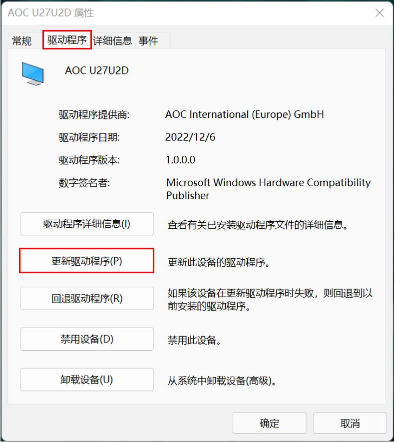 二、安装显示器驱动程序,现以Windows 11及 AOC U27U2DP机型为例说明: