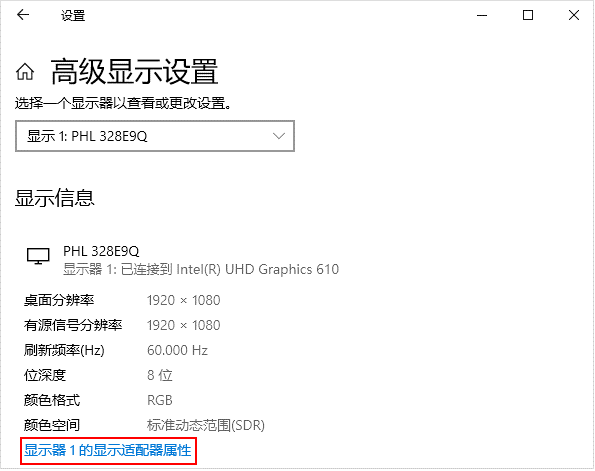 2.在弹出的显示属性对话框中点击【高级显示设置】