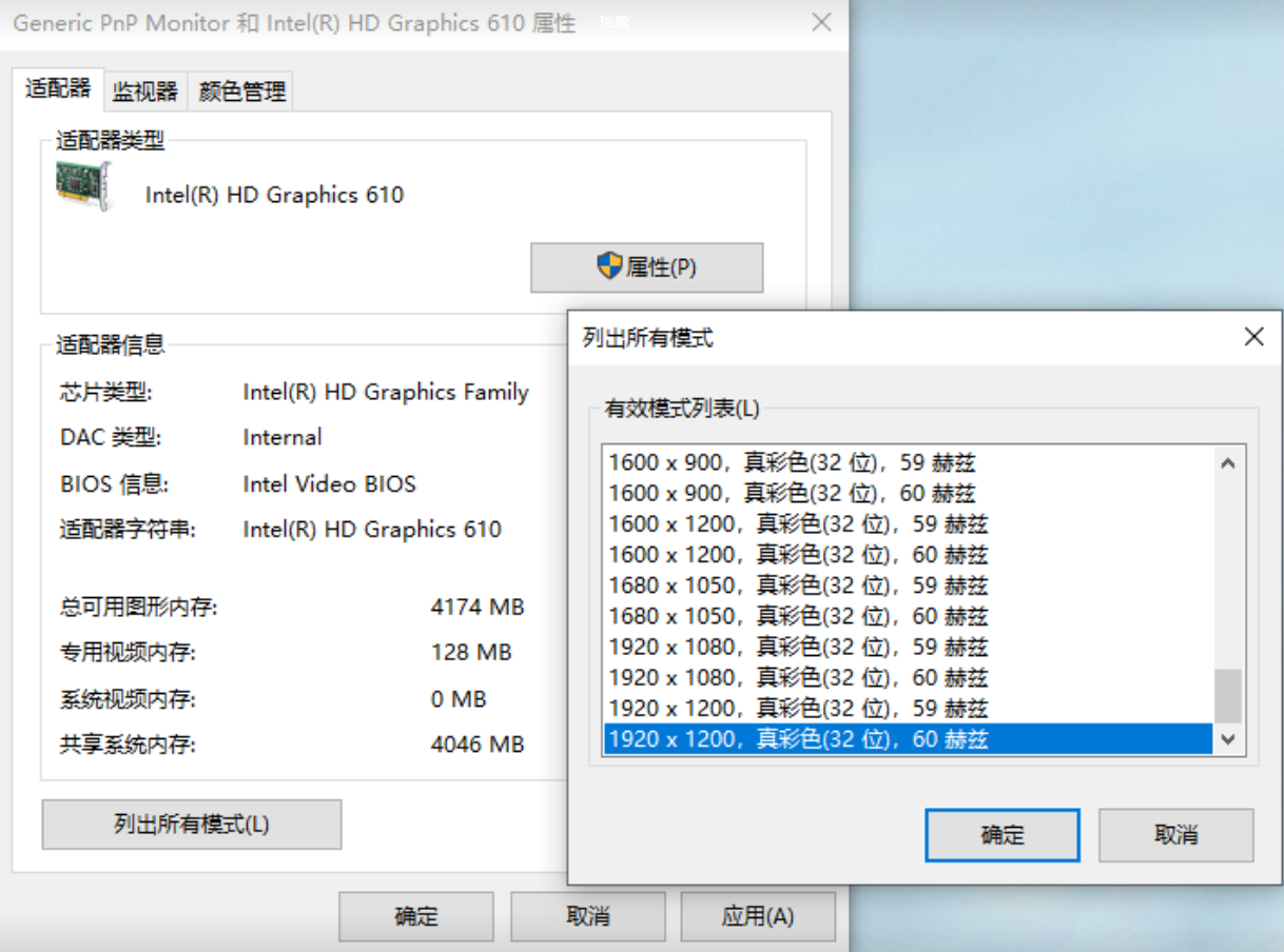 3.点击【显示适配器属性】→【适配器】,选择【列出所有模式】,任意选择其它分辨率模式后点【应用】,再返回此列表,改回原分辨率模式(重复操作至同步)。