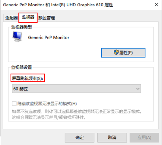 或点击【监视器】,更改屏幕刷新频率,如:改为60Hz,点【应用】;若已是60Hz,任意选择其它刷新率,点【应用】;再改回60Hz,再点【应用】(重复操作至同步即可)。