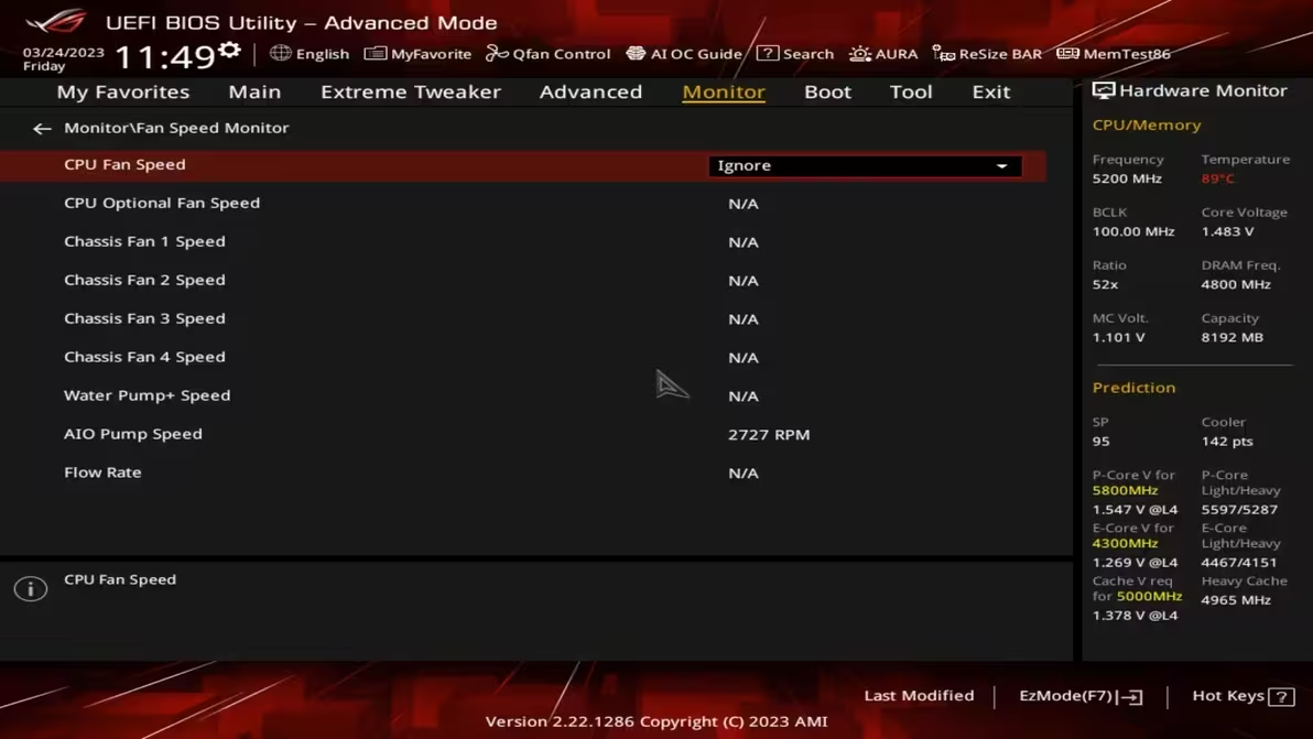 4.如果您不想打开机箱,在确定温度正常的情况下,可以进入BIOS,将Monitor(监控) -> CPU FAN Speed(CPU FAN速度)设置为Ignore(忽略)即可。