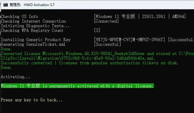 4.如果需要激活系统,按键盘数字1,等待几秒钟,之后看到activated的字样就表示已经完成激活了
