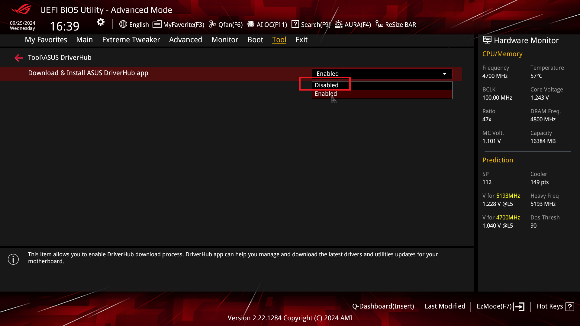 2.进入BIOS后选择Advanced Mode-> Tool ->选择 ASUS DriverHub