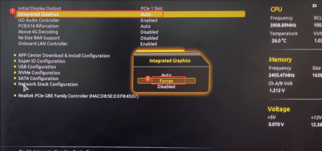 2、找到【Integrated Graphics】,将它后面选项改成【Forces】;