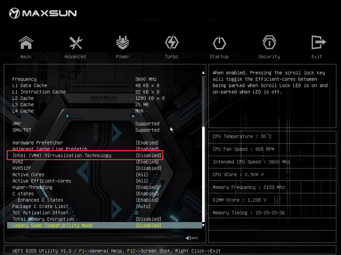 3、找到 ”Intel Virtualization Technology”,将”Disabled“设置为”Enabled“